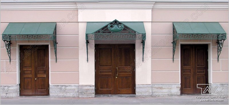 Дизайн козырька художник создает индивидуально. Важно, чтобы навес не только выполнял свои прямые функции и был эстетически привлекателен, но и деликатно вписывался в общий вид здания.